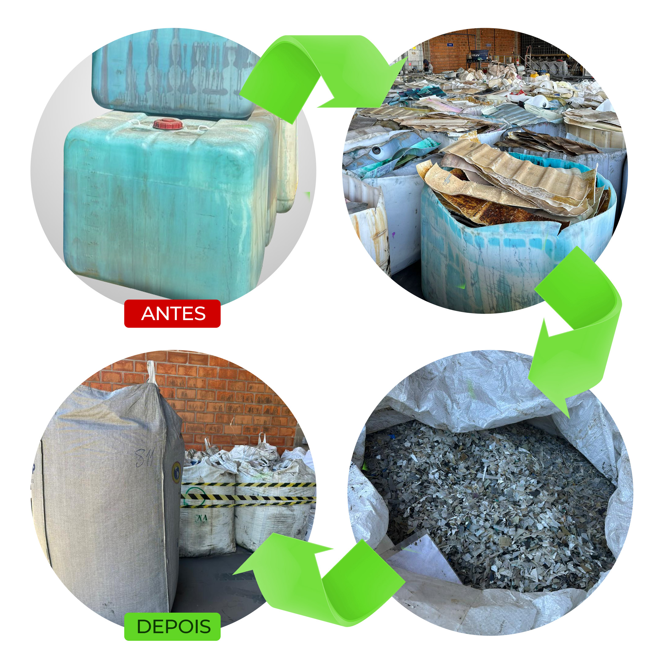 Containers de agroquímicos passam por moagem e o material resultante é enviado para destinação ecologicamente correta, garantindo segurança e sustentabilidade.